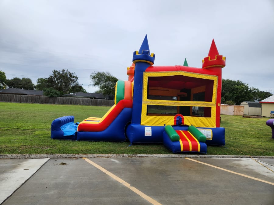 With or without water, with a stopper or with a pool, you get 2 lanes to race down. A great jumping area and a basketball hoop inside. A side entrance gives them easy access.