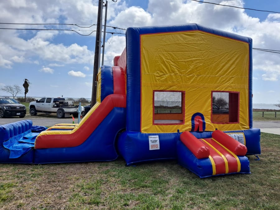 With or without water. With a stopper or a pool. 2 lanes to race down. Jumping area with a basketball hoop. Side entrance to make it easier for them to enter.