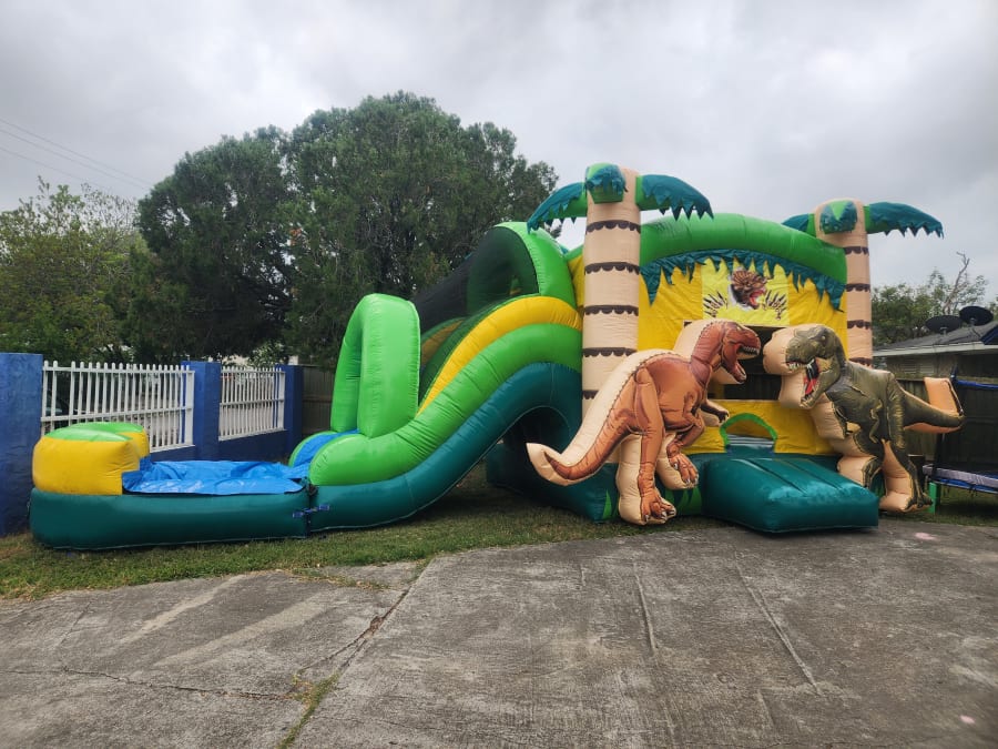 Roar into the party with our Dinosaur combo. You can use it with a pool or without. The extra wide slide gives you plenty of space to slide down.
