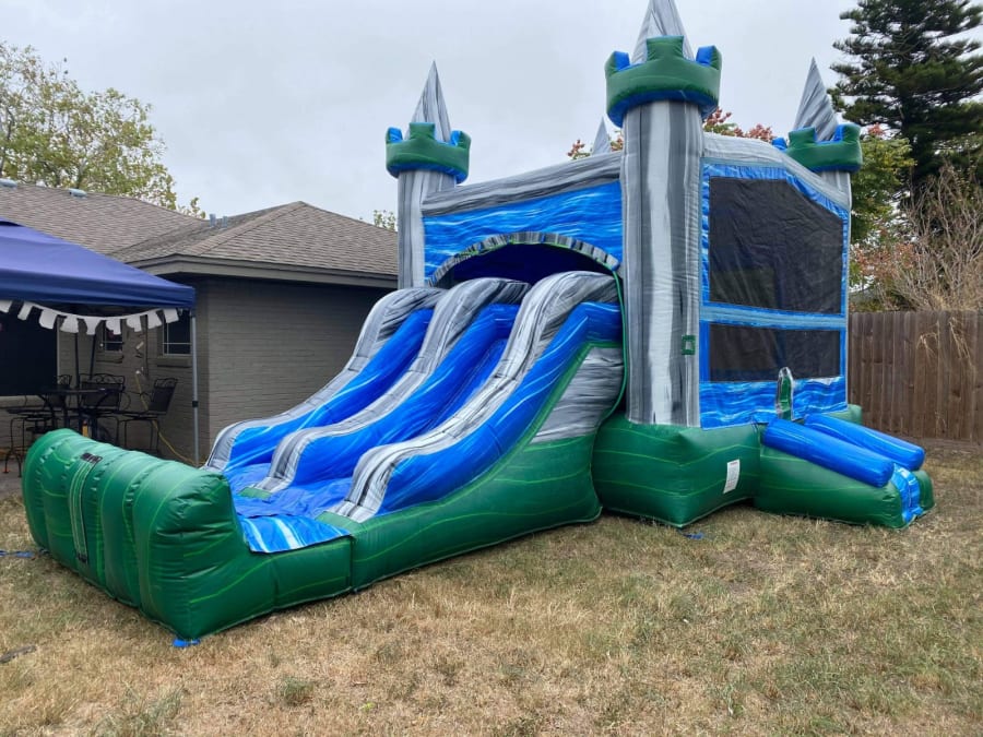 With 2 lanes to slide down the kids can race down. A great jumping area and a basketball hoop inside. Watch them slide down into a pool or into a stopper, either way, its great all day long.