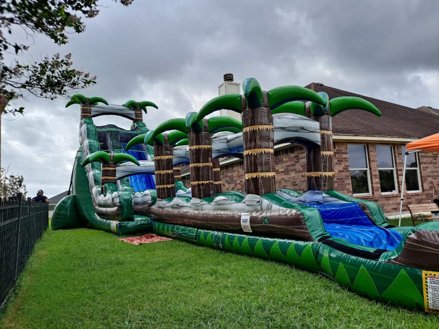 Great Fun for the entire neighborhood!!! With the stairs on the side, you climb up and slide down to the slp and slide portion. And you keep sliding under the palm trees all the way to the pool at the end. Can you make it? Can anyone make it to the end? 22 Feet hides your house and the other 56 feet may hid even the neighbor.
